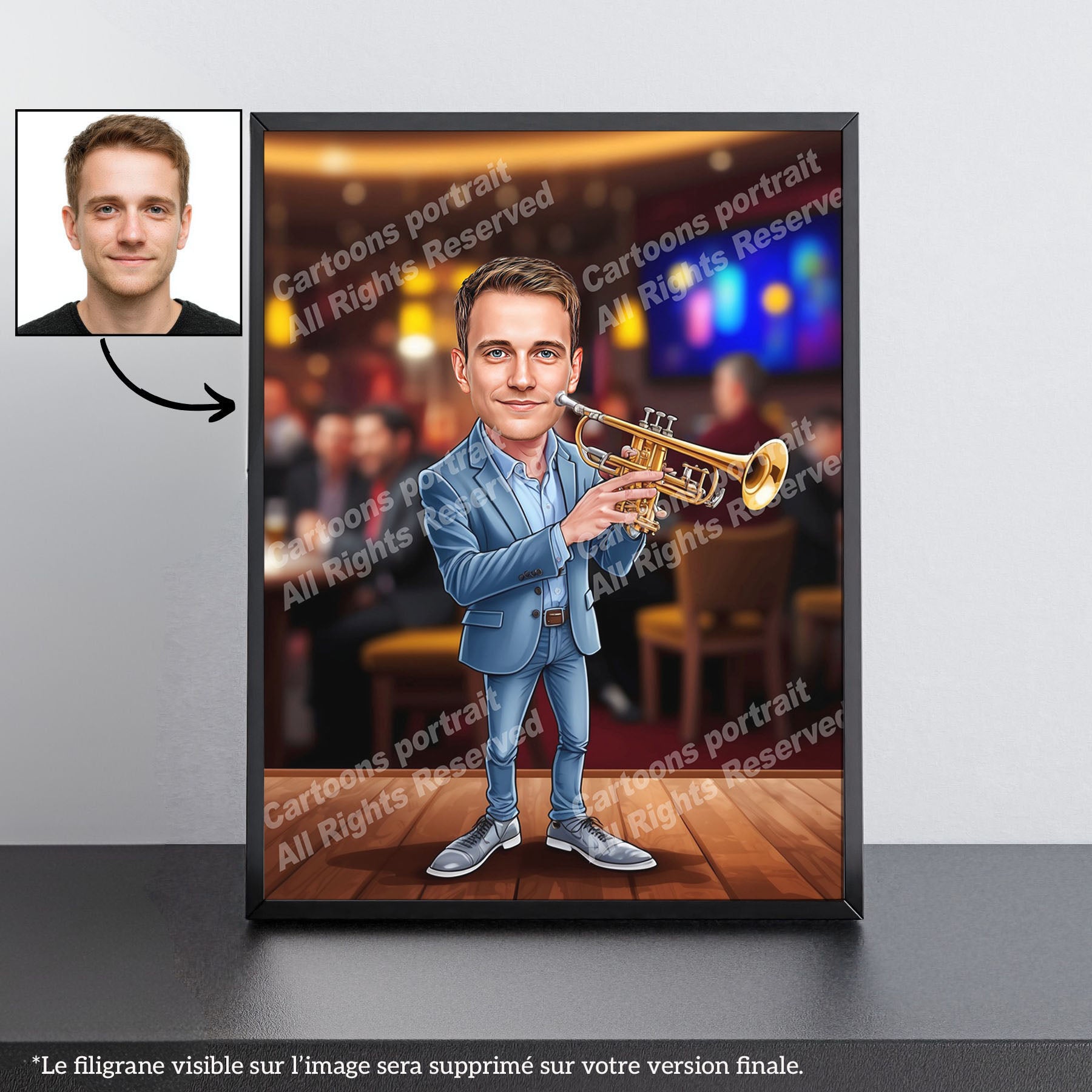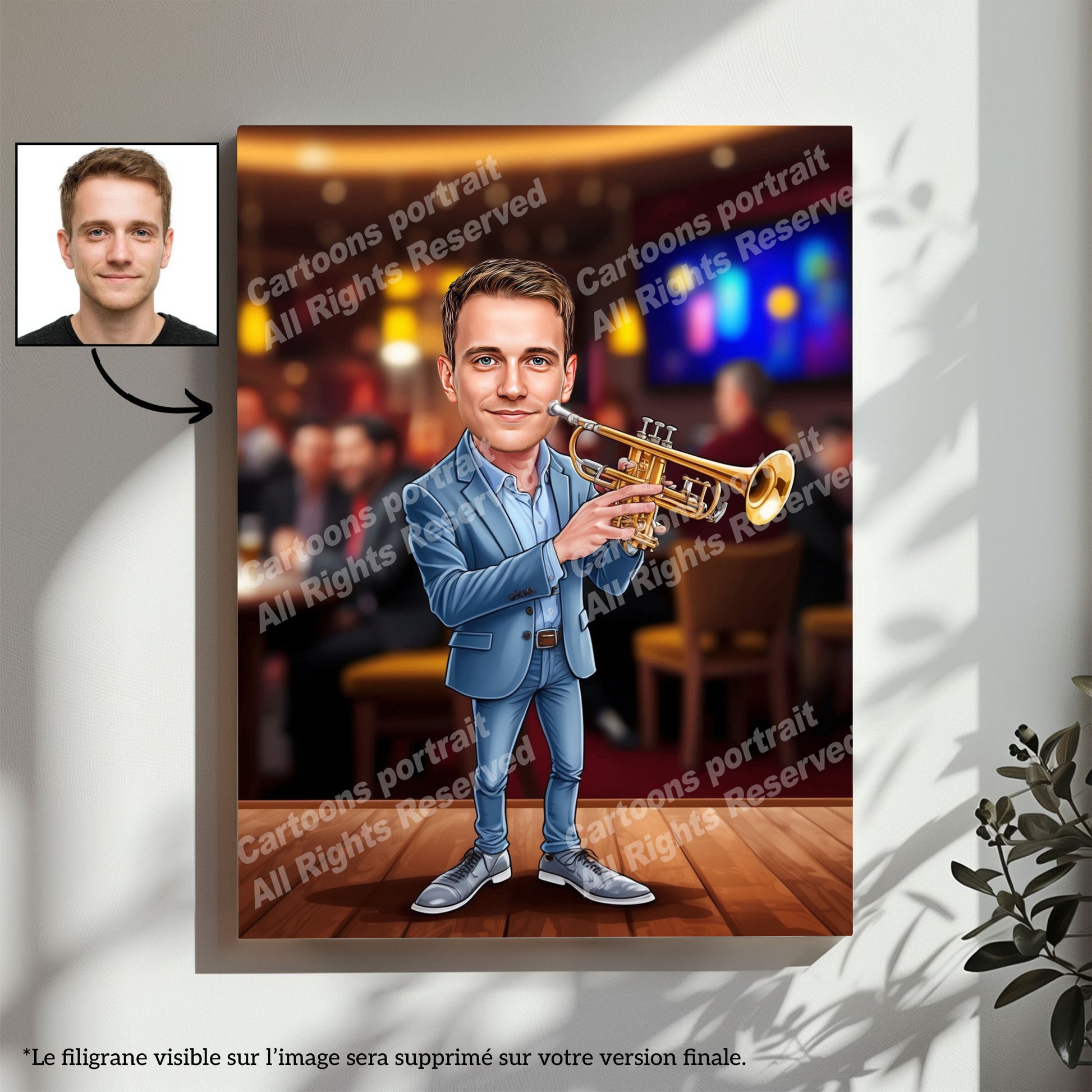Looking for a gift for a trumpet player? Our personalized caricatures are the perfect choice! Transform a simple photo into an unforgettable keepsake.
