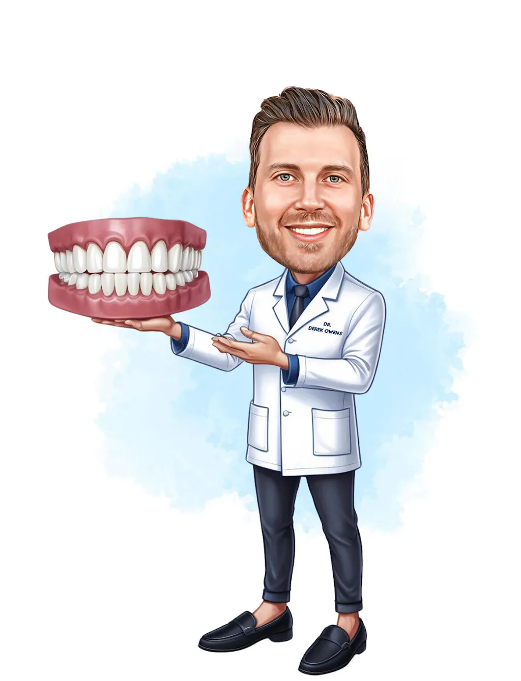 This portrait was for my brother, who is a dentist, and the result is absolutely excellent. It perfectly captures his smile and style while adding a touch of humor. He thought it was brilliant and hung it in his office right away.