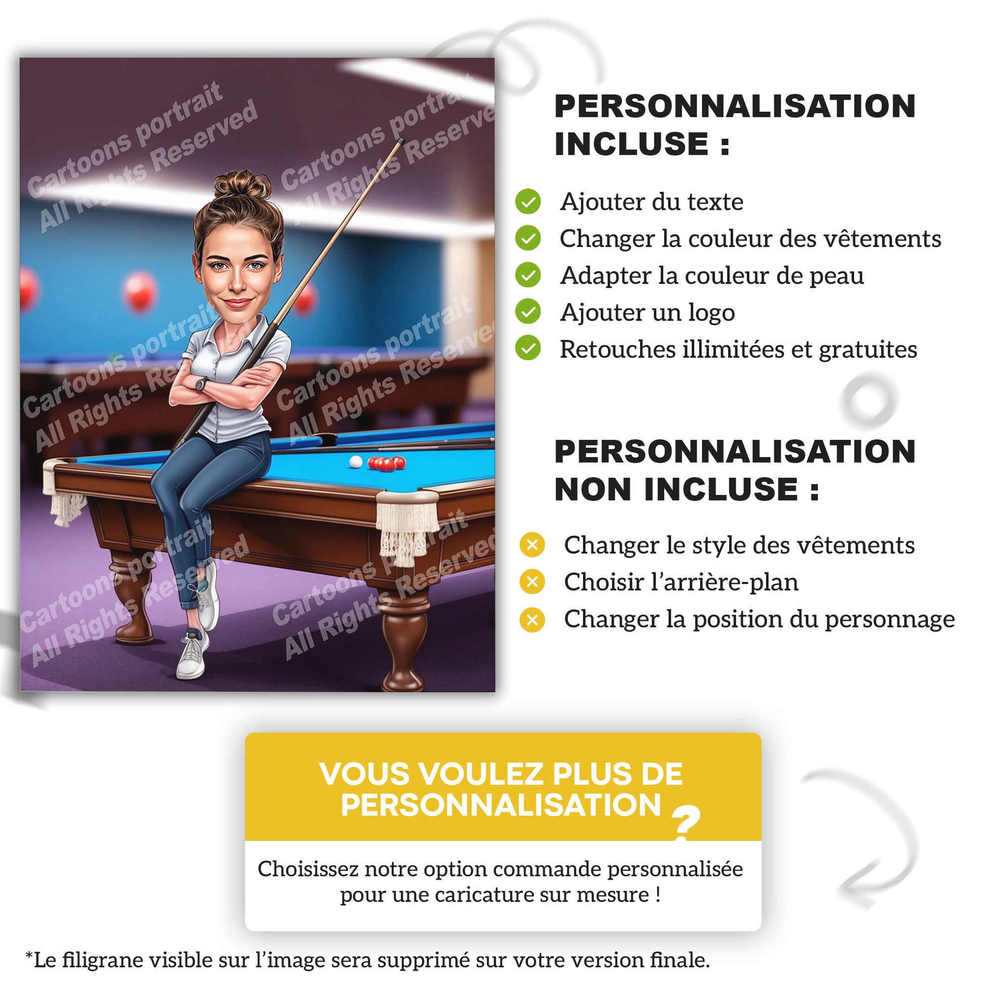 Vous cherchez un cadeau pour un joueur ou une joueuse de billard ? Nos caricatures personnalisées sont le choix parfait ! Transformez une simple photo en un souvenir inoubliable.